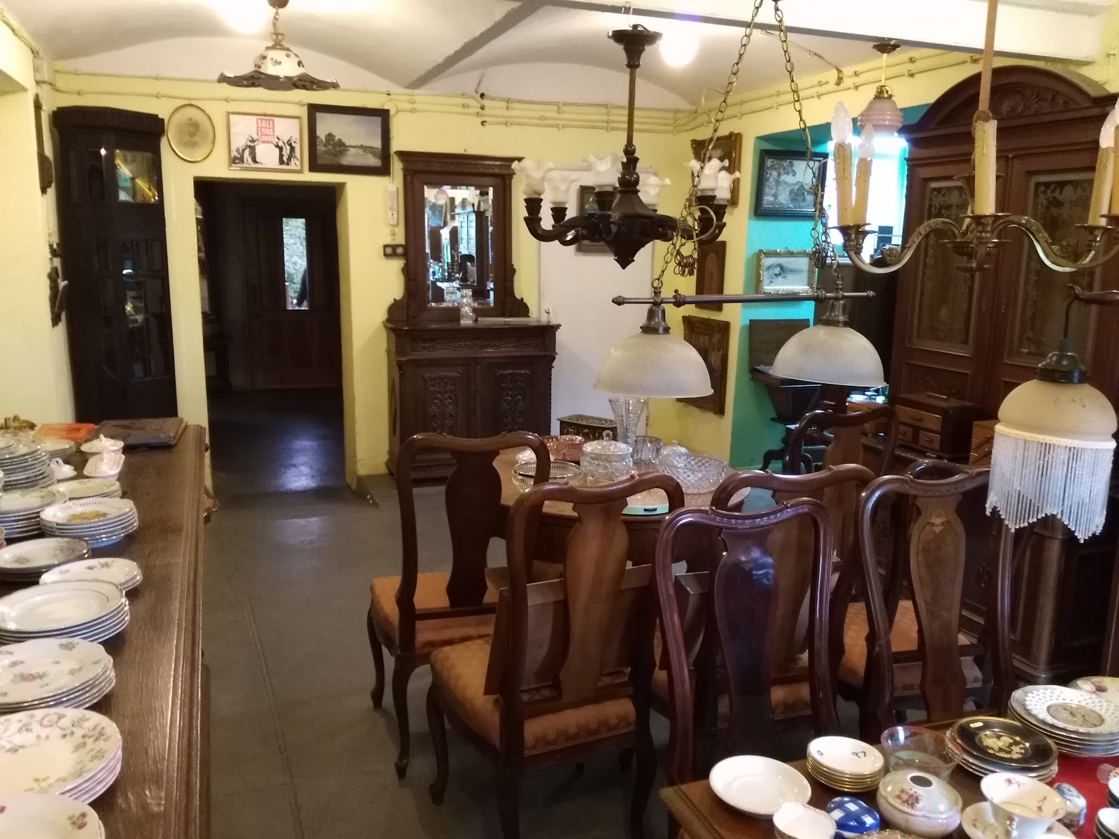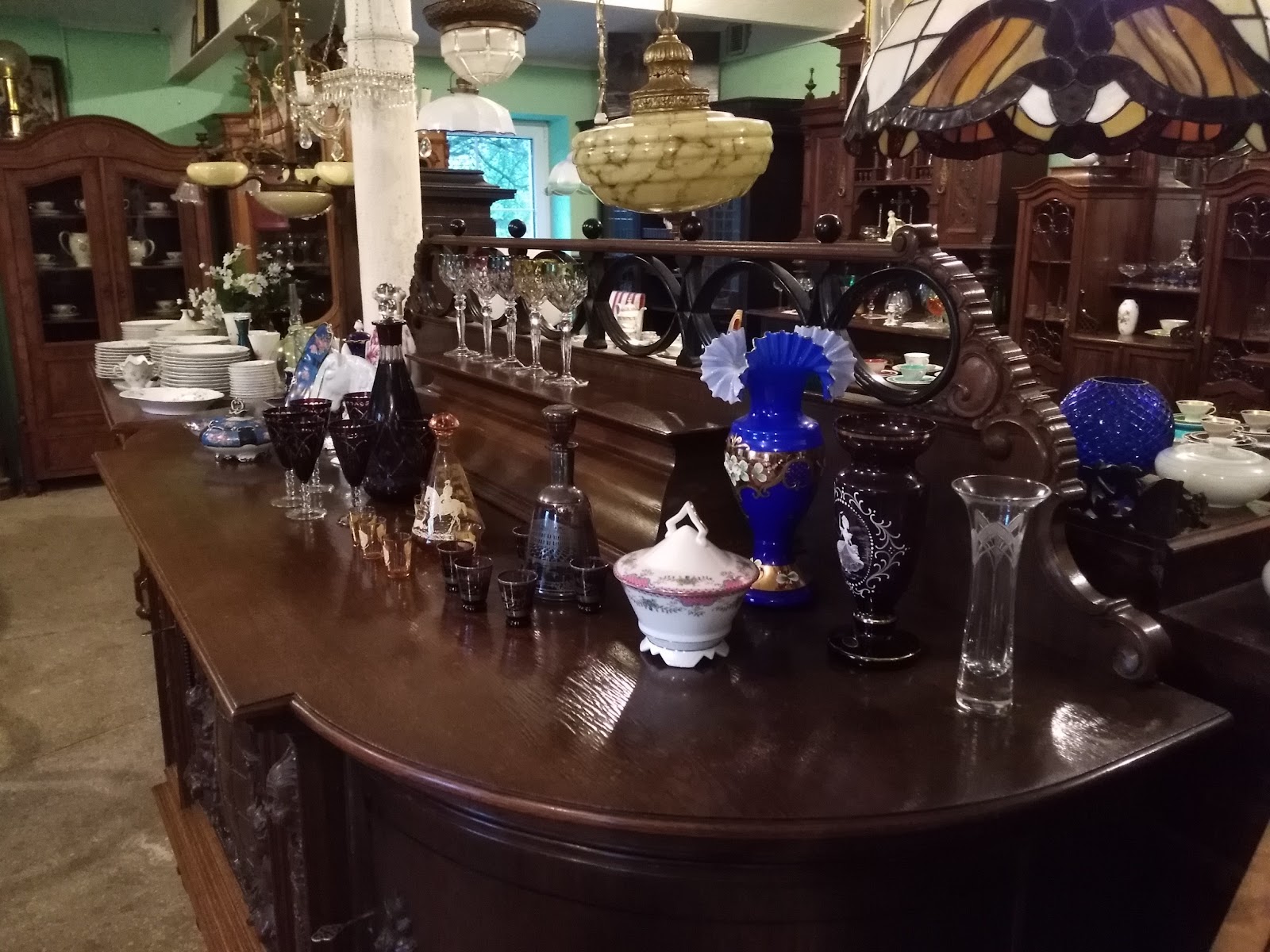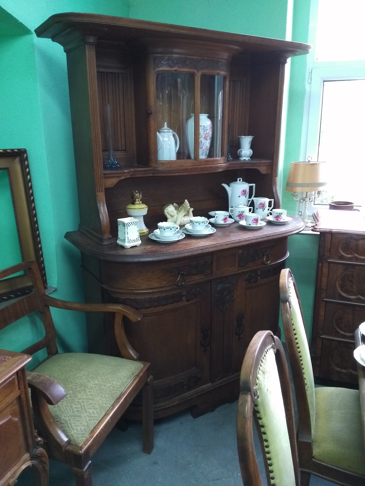 Serwantka jest chyba najbardziej wyróżniającym się meblem w całym zestawie, ma ona niezwykle ciekawy kształt i piękne zdobienia. Serwantki o tej formie bardzo rzadko się trafiają, a jeszcze do tego przyozdobione tak pięknie snycerką i charakterystycznymi giętymi drzwiczkami to prawdziwy majstersztyk. Równie ciekawy co serwantka jest bufet, jest tak samo ładny i charakterystyczny. Jednak trzeba uczciwie przyznać, że łatwiej jest znaleźć bufet tego typu niż tak interesującą serwantkę - oczywiście obydwa te meble są wyjątkowe. Bardzo dobrym dopełnieniem tego kompletu jest stół wraz z przynależnymi do niego krzesłami.